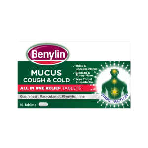 Benylin Mucus Cough & Cold All In One Relief Tablets are a combination medicine designed to relieve the symptoms of chesty coughs, nasal congestion, and mild to moderate pain or fever associated with colds and flu.