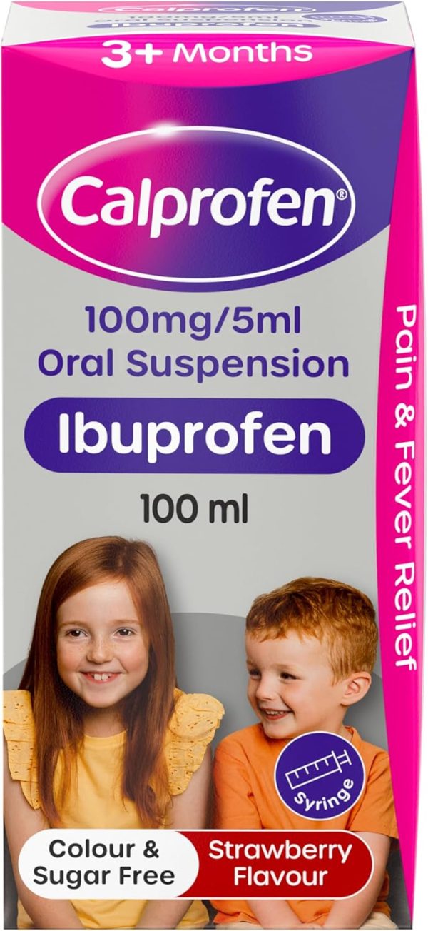Calprofen 100mg/5ml Oral Suspension is a children’s ibuprofen medicine in a easy-to-swallow liquid form. It is used to relieve mild to moderate pain, reduce fever (high temperature), and ease inflammation in children aged 3 months and over (weighing more than 5kg).