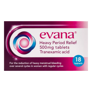 Evana Heavy Period Relief 500mg Tablets contain tranexamic acid, a medicine used to treat heavy menstrual bleeding (also known as menorrhagia). They help reduce the amount of blood lost during your period, making it more manageable.