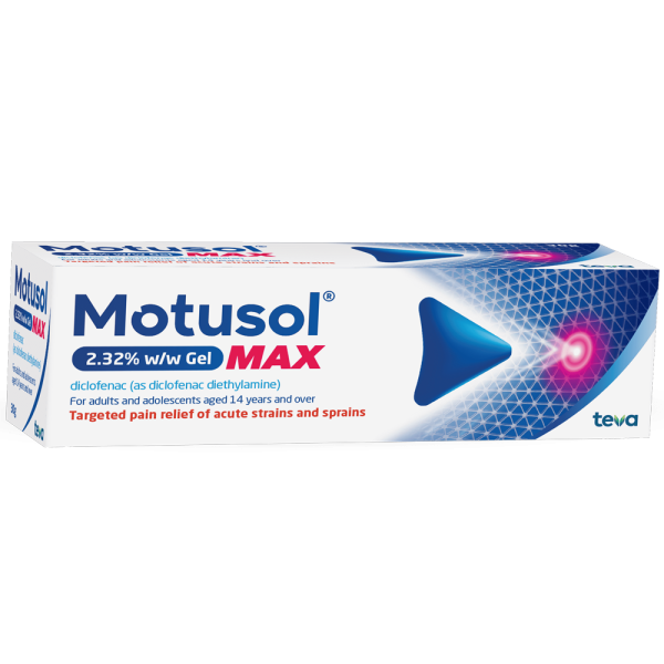 Motusol Max 2.32% Gel is a topical pain-relieving gel containing diclofenac sodium, used to relieve pain, swelling, and inflammation associated with soft tissue injuries such as sprains, strains, and bruises in adults and adolescents aged 14 and over.
