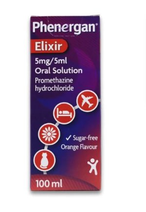 Phenergan Elixir 5mg/5ml Oral Solution is an medicine that offers relief for various conditions. It contains the active ingredient promethazine hydrochloride, an antihistamine commonly used to treat allergic conditions such as hay fever, allergic rhinitis and allergic skin reactions. Additionally, Phenergan combats motion sickness, and alleviating nausea and vomiting and ensuring a comfortable journey. It helps as a temporary solution for insomnia, aiding in achieving a restful night’s sleep.